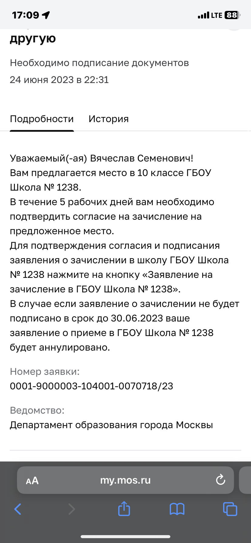 В уведомлениях по обработке заявлений на перевод, приходящих с портала mos.ru, отображается юридический адрес школы: ул. Чоботовская д.19.